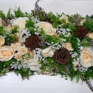 Extra méretű főasztaldísz, az alkalomhoz és hozzátok illő színvilágú selyemvirágokból. Mérete és látványos megjelenése miatt a főasztal mellett használható szertartások helyszínén is.